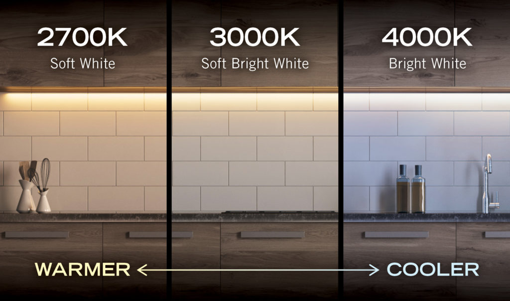 Generally, when the kitchen is not a large open space, a cool warm white of 3000K is preferable as it has a more task-oriented feel.