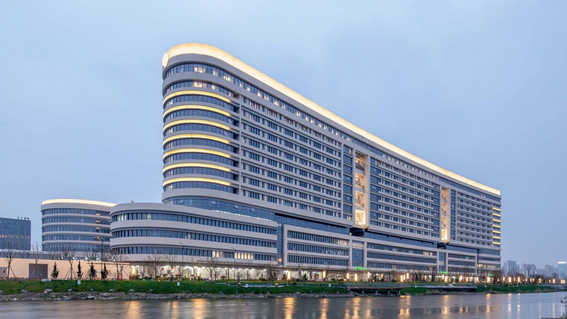 Details: The architectural lighting design of the hospital blend in with the lake next to this building. The reflections on the lake and the lights of the buildings complement each other.