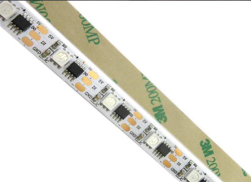 WS2812B LED strips are DC5v individually addressable strips with IC embedded into 5050 LEDs. The built-in IC is invisible from the outside, which makes the strip stronger and more flexible, and can be applied to different types of surfaces. Each LED is cuttable as an individually addressable pixel. WS2812B LED strip has only one data signal when one pixel dies, the signal cannot pass through.