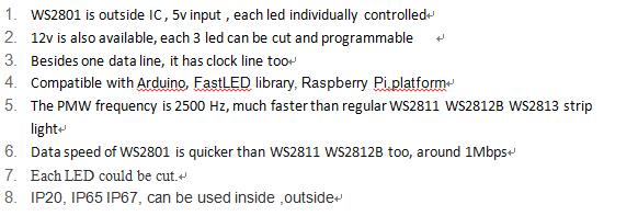 WS2801 magic RGB LED strip data speed transfer is much quicker than WS2812 WS2811 programmable tape light, Its speed is 1Mbs Vs 800kbs,