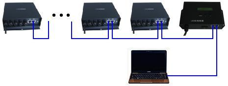 (4). When port2 of ST803TC is used as input interface, it could connect to computer、digital switch、photoelectric converter or other controllers’ output interface, and the parameters of Net2StartNo are effecting port1, the value of data of slave controller that less than the parameters will be shielded off. The slave controller behind will be renumbered from number 1. ST803TC can retransmit maximum 239 data from slave controller, using this point, we can use digital switch to accomplish multiple ports output, please refer to the Network and Optical fiber connecting diagram. For example: We can set 40 slave controllers in computer, send data to switch, connect switch to 4 ST803TCs and connect each ST803TC to 10 slave controllers. The data that switch output is consistent with computer’s. We can set Net2StartN.to 1 for the first ST803TC, set 11 for the second one, set 21 for the third one and set 31 for the fourth one. Then, each slave controller connected to ST803TC is corresponding to each slave controller we set in computer.