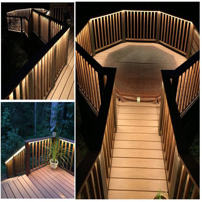 One of our customers did a fantastic job with the AC LED flex strips. Running the Warm White strip under the handrail of the deck made for a great accent light around the whole deck and leading down to the hot tub. This provides a perfect indirect accent light for nights out on the deck!