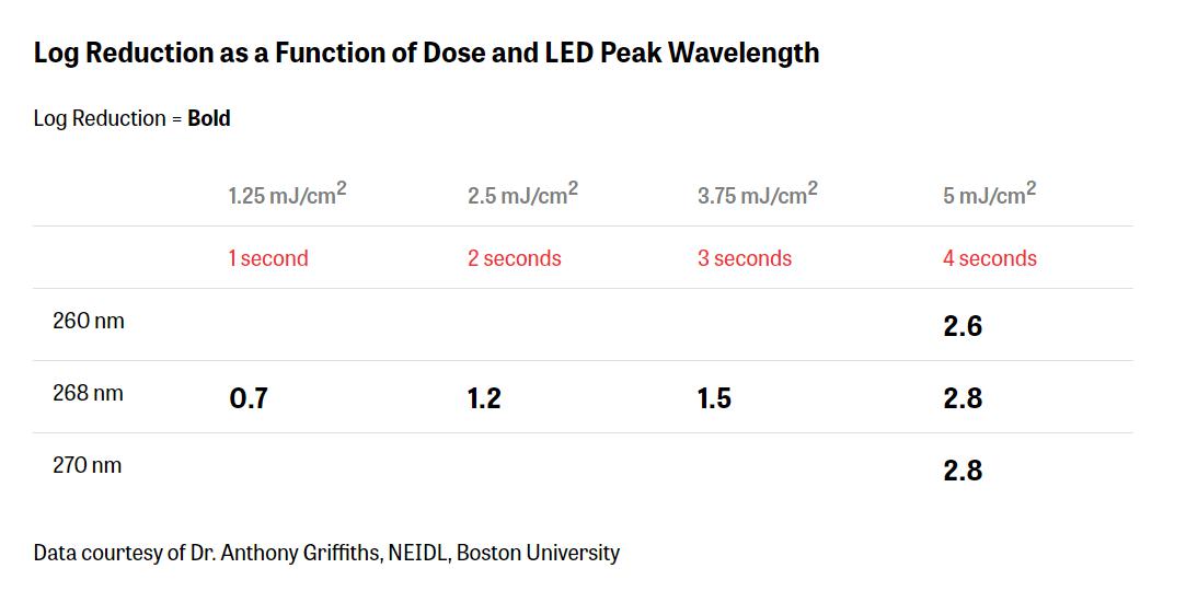 The researcher then repeated the test with a UVC LED with a dose of 5mJ/cm2. The peak wavelength is the two ends of the Suntech UVC LED product wavelength specification, namely 265nm and 278nm. The results show that the sterilization and disinfection effectiveness is similar in the tested wavelength range.