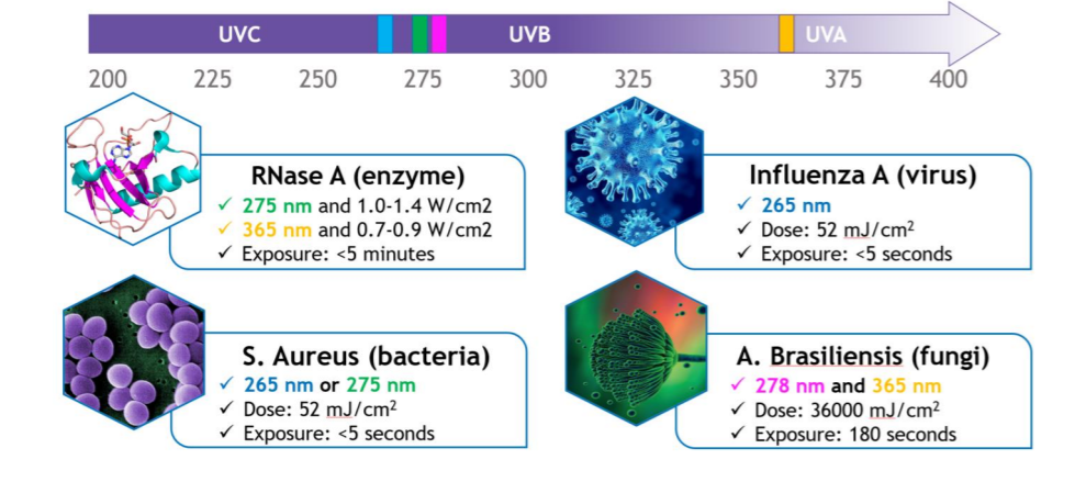 260 -265 nm: It is an effective bactericide and has shown excellent effects on influenza A³ viruses. It also uses nucleic acid damage as a mechanism of action and can be used in UV LED lamps.