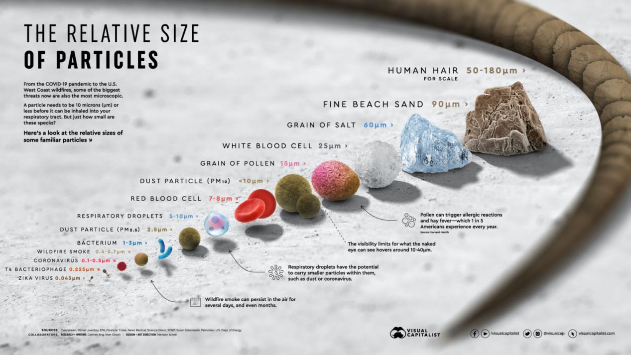 It is now widely believed that the virus SARS-CoV-2 (Severe Acute Respiratory Syndrome, Coronavirus 2) that causes the coronavirus disease Covid-19 is airborne. When we cough, there are heavier water droplets spreading several meters away. However, there are smaller droplets that are invisible to the naked eye. These tiny droplets are between 60 nanometers (nm) and 140 nanometers (nm) in size. That's really small.